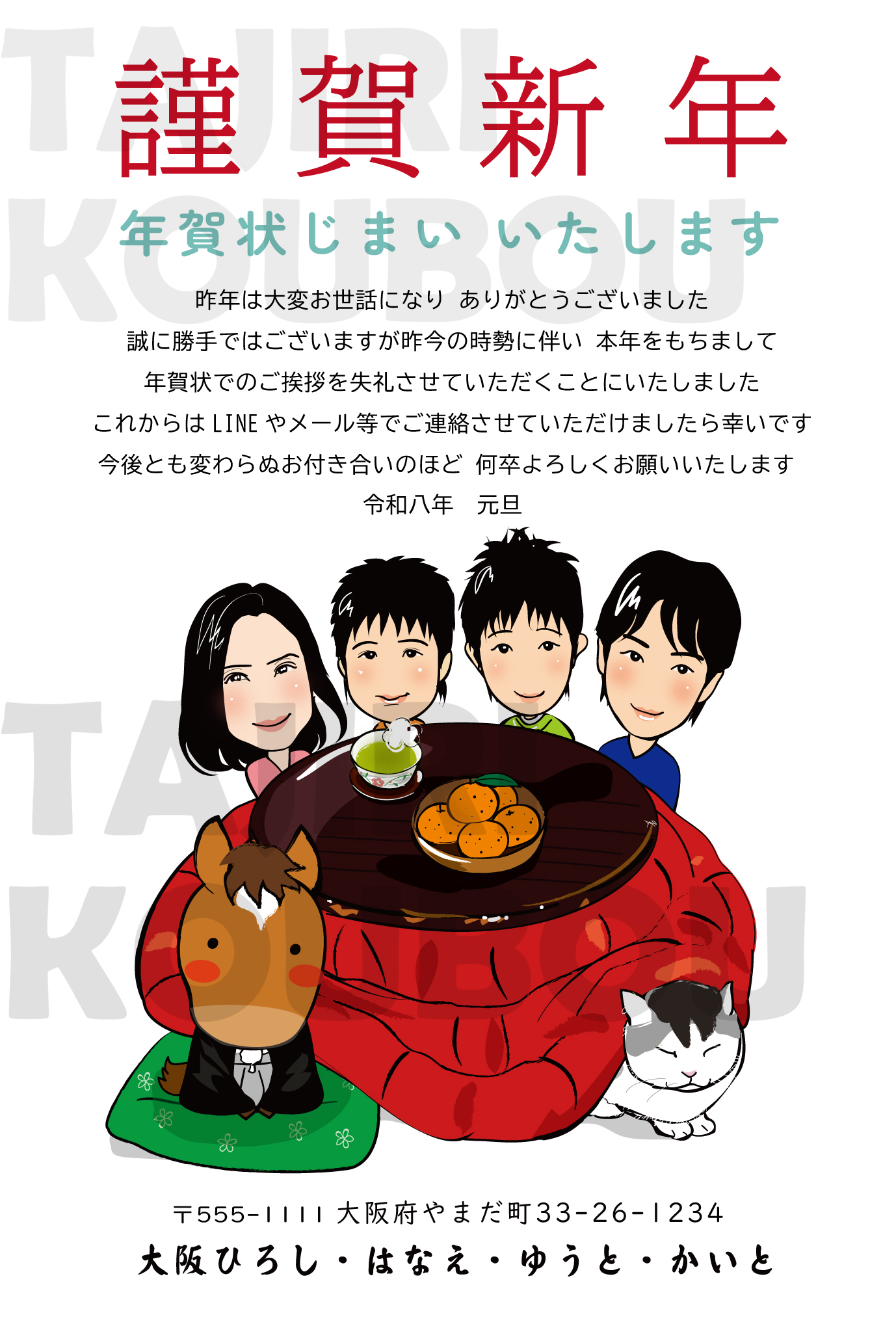 こたつと馬と猫のイラストのほっこり似顔絵年賀状です